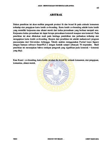 Dalam penelitian ini akan melihat pengaruh product fit dan brand fit pada attitude konsumen terhadap niat pengajuan kartu kredit co-branding. Kartu kredit co-branding adalah kartu kredit yang memiliki kerjasama atau aliansi merek dari kedua perusahaan yang berbaur menjadi satu. Kerjasama kedua perusahaan ini dapat berupa perusahaan komersil maupun non-komersil. Pada penelitian ini akan dilakukan studi pada lembaga pendidikan dan perbankan terhadap niat mengajukan kartu kredit co-branding. Respon dari penelitian ini adalah mahasiswa/i program pascasarjana dari Universitas Airlangga. Teknik analisis menggunakan Partial Least Square dengan bantuan software SmartPLS 2 dengan Jumlah sampel sebanyak 70 responden. Hasil penelitian ini menunjukan bahwa terdapat pengaruh yang signifikan pada konstruk – konstruk yang diuji.