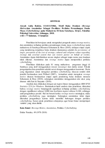 AISYAH AULIA RAHIM, 111411131066 (2018) MOTIF BALAS DENDAM (REVENGE MOTIVE) DAN ANONIMITAS SEBAGAI PREDIKTOR PERILAKU PERUNDUNGAN DUNIA MAYA (CYBERBULLYING) PADA MAHASISWA DI KOTA SURABAYA. Skripsi thesis, Universitas Airlangga.