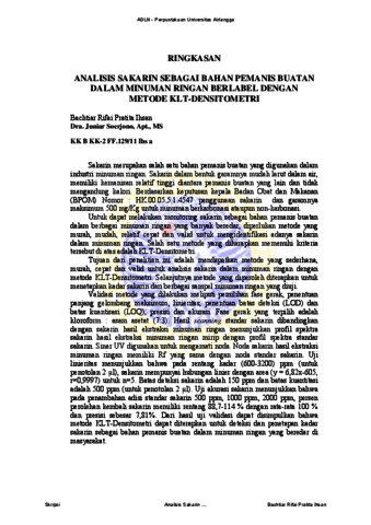 Bachtiar Rifai Pratita Ihsan, 050610112 (2010) ANALISIS SAKARIN SEBAGAI BAHAN PEMANIS BUATAN DALAM MINUMAN RINGAN BERLABEL DENGAN METODE KLT-DENSITOMETRI. Skripsi thesis, UNIVERSITAS AIRLANGGA.
