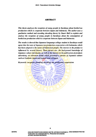 This thesis analyzes the reception of young people in Surabaya about bottled tea production which is cooperate between Japan and Indonesia. The author uses a qualitative method and encoding decoding theory by Stuart Hall to explain and analyze the reception of young people in Surabaya about the consumption of bottled tea production which is cooperate between Japan and Indonesia. The results is showed that Japanese languange collage student in Surabaya would agree that the taste of Japanese tea production cooperation with Indonesia, which has been adapted to the tastes of Indonesian people. The interest in the product is influenced by several factors. These factors are: the background knowledge of Japanese culture informants, as well as the interest in the publication of products advertising on television media which presented a picture of Japanese culture such as Ganbatte Japan and typical icons of Japan.