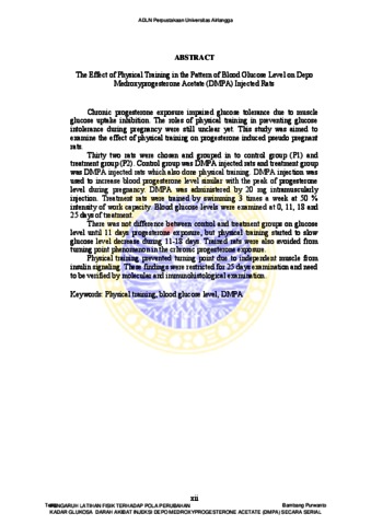 The Effect of Physical Training in the Pattern of Blood Glucose Level on Depo Medroxyprogesterone Acetate (DMPA) Injected Rats. Chronic progesterone exposure impaired glucose tolerance due to muscle glucose uptake inhibition. The roles of physical training in preventing glucose intolerance during pregnancy were still unclear yet. This study was aimed to examine the effect of physical training on progesterone induced pseudo pregnant rats. Thirty two rats were chosen and grouped in to control group (P1) and treatment group (P2). Control group was DMPA injected rats and treatment group was DMPA injected rats which also done physical training. DMPA injection was used to increase blood progesterone level similar with the peak of progesterone level during pregnancy. DMPA was administered by 20 mg intramuscularly injection. Treatment rats were trained by swimming 3 times a week at 50 % intensity of work capacity. Blood glucose levels were examined at 0, 11, 18 and 25 days of treatment. There was not difference between control and treatment groups on glucose level until 11 days progesterone exposure, but physical training started to slow glucose level decrease during 11-18 days. Trained rats were also avoided from turning point phenomenon in the crhronic progesterone exposure. Physical training prevented turning point due to independent muscle from insulin signaling. These findings were restricted for 25 days examination and need to be verified by molecular and immunohistological examination.