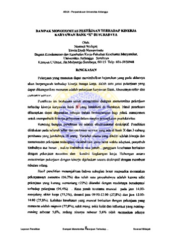 Noeroel Widajati, S.KM. and Erwin Dyah Nawawinetu, dr., M.Kes. (2006) DAMPAK MONOTONITAS PEKERJAAN TERHADAP KINERJA PADA KARYAWAN BANK "X" DI SURABAYA. Universitas Airlangga, Surabaya. (Unpublished)