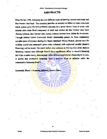 Since the late 1991, Indonesia has two different types of banking; interest rates bank and free interest rates bank. This situation provides an investor or debtor to make a decision which system gives the best profitable outcome for a given choice. Loan or credit with interest rates costs fixed component of total cost neither the free interest rates bank .During inflation, free interest rates system reduces revenue from debtor by its amount. Through Mehra's Error Correction Model relationship pattern for those explanatory variable (rates of revenue sharing for Sharia Interbank Money Market, interest rates for working capital and consumer's price index inflation) with explained variable (sharia's financing) will be tested. The result indices that inflation on first lag does affect sharia's financing. Interest rates although doesn't have significance affect to sharia's financing but it has a contra theory phenomenon. After differentiated sharia's financing to its uses, it proves that productive financing have a positive slope to inflation while the consumptive financing doesn't.