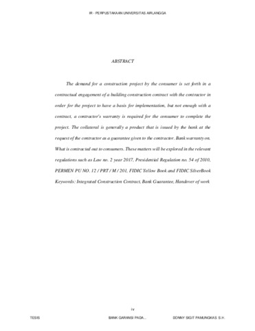 DONNY SIGIT PAMUNGKAS, 031514153044 (2018) BANK GARANSI PADA KONTRAK JASA KONSTRUKSI TERINTEGRASI. Thesis thesis, Universitas Airlangga.